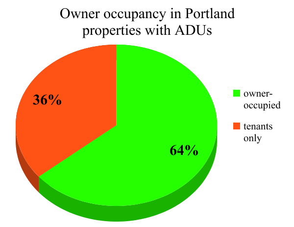 64% of the 701 surveyable Portland properties with ADUs had an owner living in at least one of the units. (Caveat: this number might be refined up or down a little as Jordan’s work progresses, because some of these units are still under construction and unsold.)