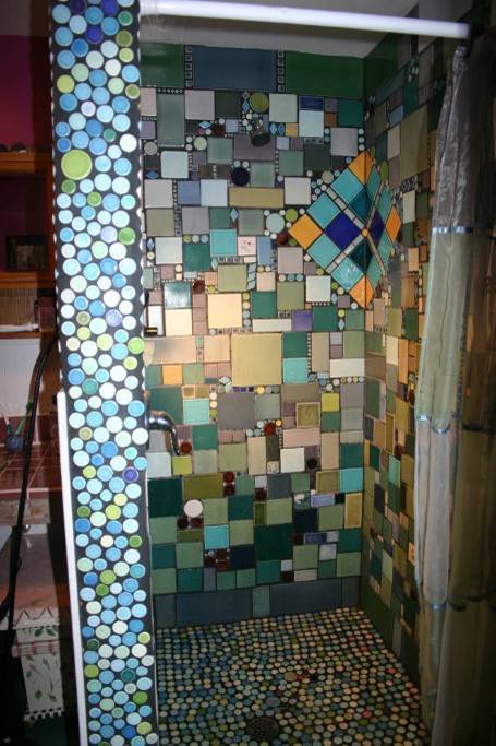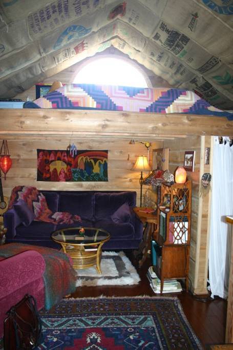 The interior space of this unpermitted ADU is charming and lovely in its own right. It is a wonderful, cozy, and personal space, perfect for a single person or two intimate people. Architecturally, scissored trusses, a bathroom, a loft, and three windows were added. A kitchen and bathroom were built with simple framing, plywood, and tile, and fully plumbed. The existing garage wall framing was used and the studs were sistered. The ceiling finish is simple and lovely—free burlap coffee bean bags stapled to framing members. The walls and ceiling are insulated with closed cell spray foam, and a single cadet heater adequately heats the whole structure. It’s quiet although it’s urban. The talavera tile work in the kitchen and bathroom and trusses give the space an artistic flare.