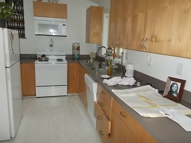 kitchen of Lissa Kaufman’s ADU with white flooring and light cabinets