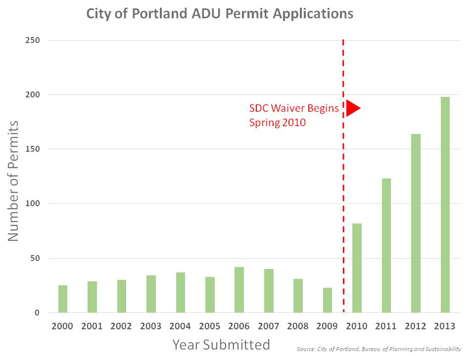 The City of Portland continues to grow its ADU housing stock. In 2013, there were almost 200 ADU permit applications received, which is about 25% of all single-dwelling permits in Portland. In total, there are approximately 800 completed and permitted ADUs in Portland. The chart shows the dramatic impact of the 2010 waiver of System Development Charges (SDCs), which reduces the cost of building an ADU by $8,000-11,000.