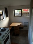 Once he determined that it would be possible to build a larger home at the front of the lot, Caleb decided the first step was to remodel the 450 square foot ADU. He implemented “little things that make it feel like a bigger space.” He moved the water heater into the attic, created a built-in dining nook which takes up less space than a table and chairs, and installed a 24″ range instead of a full-size version.