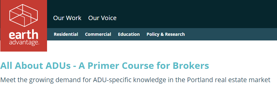 It’s a half-day course is intended for brokers who need to increase their knowledge about Accessory Dwelling Unit (ADU) development, in order to respond increasing client demand for properties with ADU potential. Many prospective home buyers are interested in building an ADU on their property. This course is intended to help brokers understand the basic planning and building regulations for ADU development in the City of Portland in order to better assist their clients