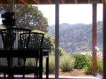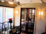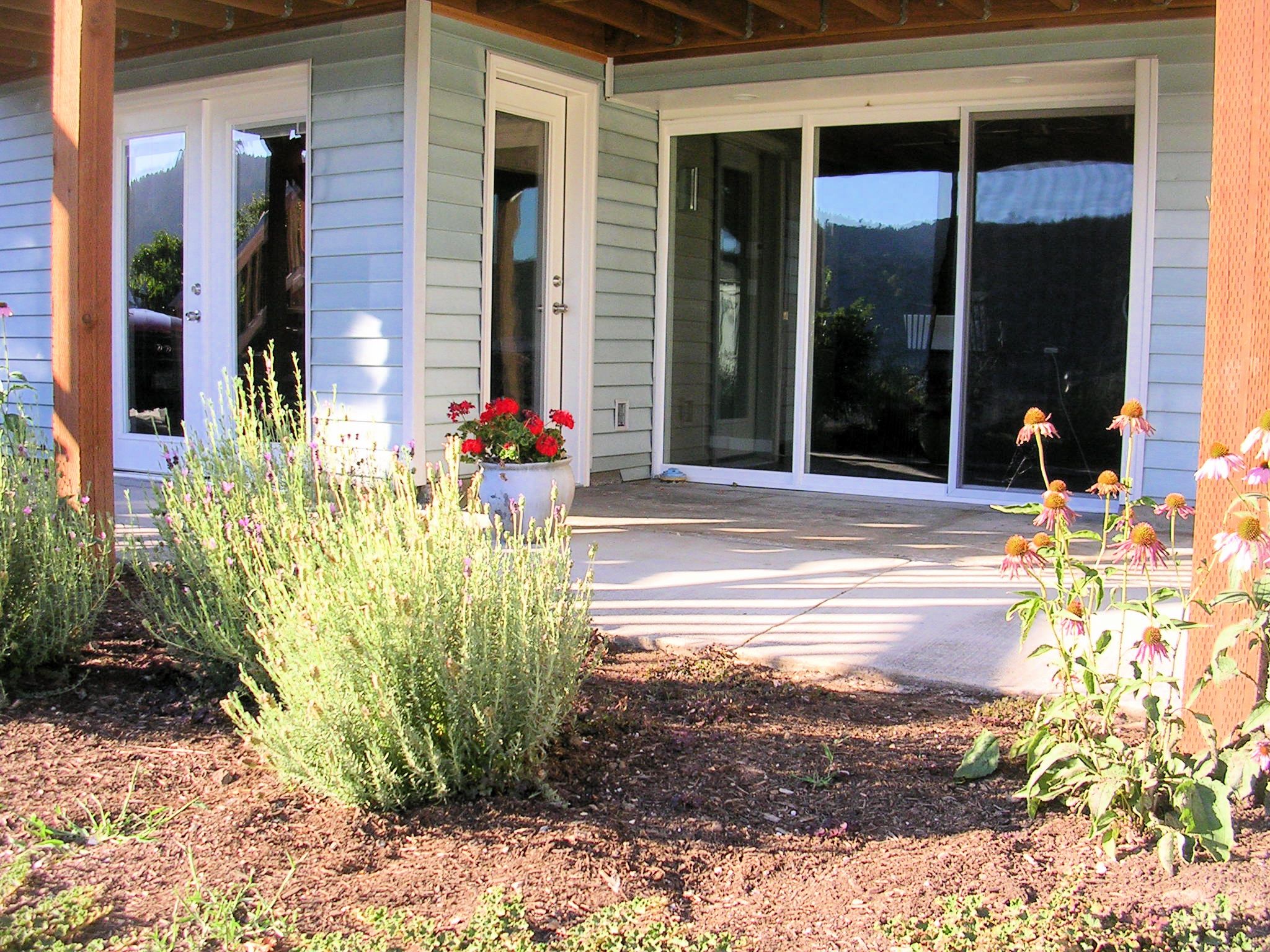 French doors from bedroom in Clark & Chen ADU open out onto a covered patio with views of Forest Park