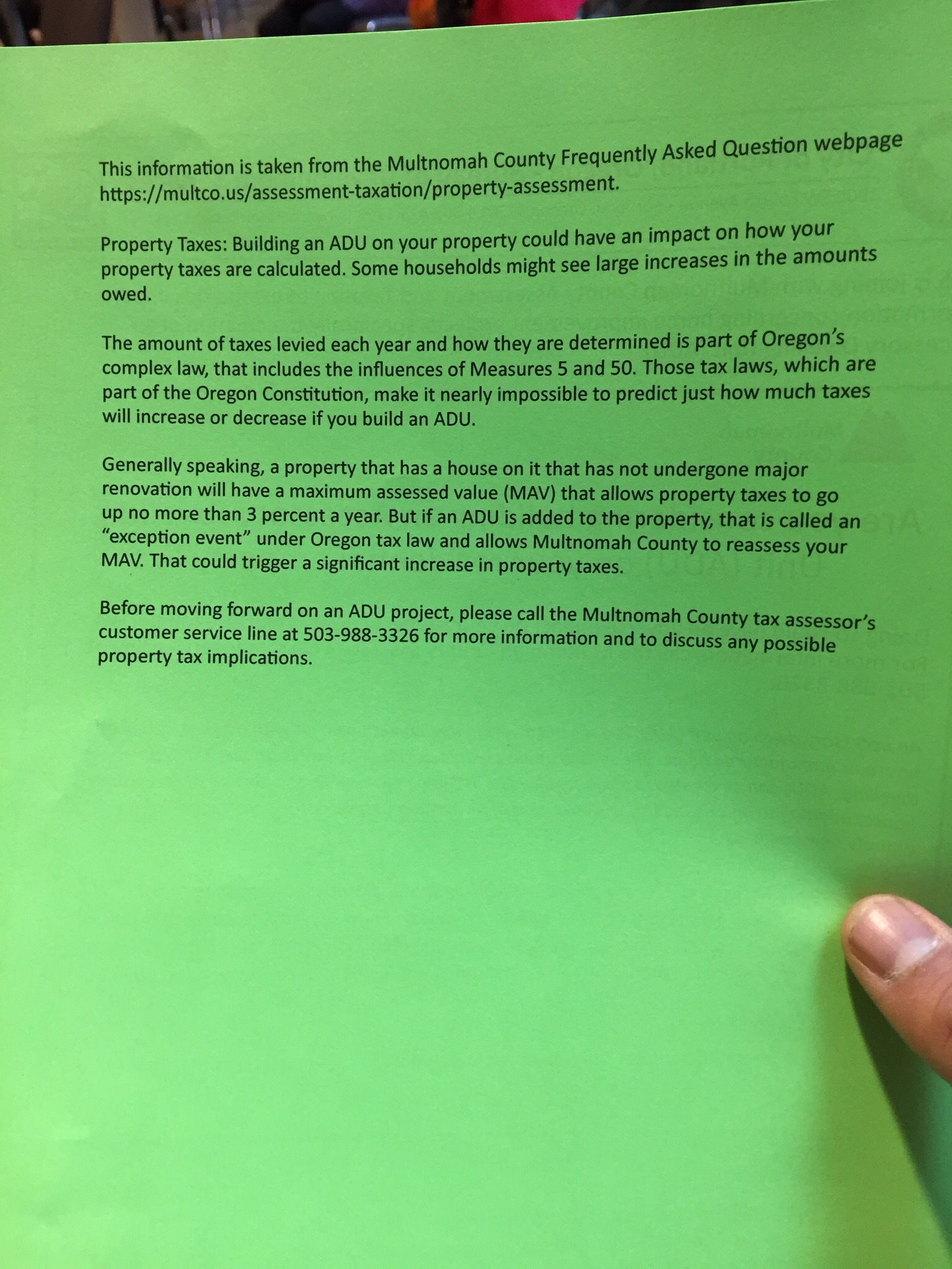 The other irony here is that Multnomah’s current claim that “the tax laws of….the Oregon constitution, make it nearly impossible to predict just how much taxes will increase or decrease if you build an ADU” is untrue.