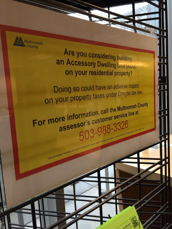 The only problem with this page is it provides NO helpful information or guidance. The page should attempt to describe what the financial impacts of an ADU would be. Instead, this page providing absolutely zero information about the financial impacts that Multnomah County’s tax assessor has arbitrarily chosen to saddle on ADU owners, beginning in tax year 2015/2016.