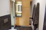 Jen and Bryan Scott of Zen Box Design are now the proud designers and owners of 460 square feet with a Nanawall folding glass wall, DIY rolling doors, a wood counter that rolls out into a table, concrete counter tops, a four burner gas stove, a two pot dish washer, various reclaimed wood (mostly Fir) cabinets, oriented strand board floors, a gas fireplace and a spacious concrete bathroom with a sky light. Their dog Karma enjoys the outdoor space.