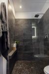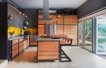 The Solutions: Our solution was to keep as much of the existing garage as open space as possible. We built walls around the bathroom for privacy, but literally everything else becomes a shared space, where all activities happen in a single, flexible space. A very large kitchen and entertaining space is the primary focus of the project. The kitchen cabinets are all custom made of steel and reclaimed wood and the concrete countertops poured in place. A rolling island/bar spins out to seat 6 for dinner and create additional seating as needed. “Luxury items” in the build include a 16ft accordion door (that literally removes any separation between indoor and outdoor spaces) and a large “wetroom” bathroom with concrete walls/floor/ceiling, dual rainfall shower heads and a large skylight that floods the space with natural light.