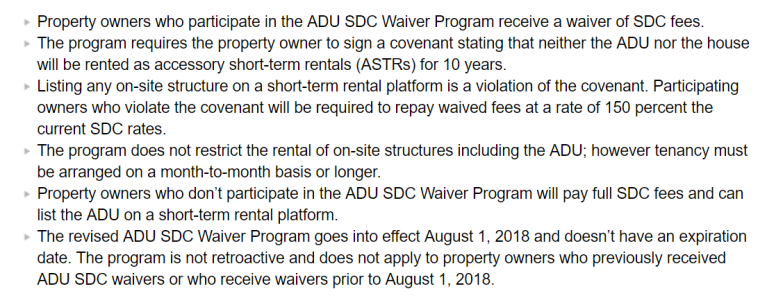 2) Secondly, some more well-researched homeowners fully understood that the new permanent SDC waiver policy which began on August 1st, 2018, carried with it a new provision that stipulated that they could no longer use their property for short-term rental without incurring the SDC fee of $14-19K (see policy description below).