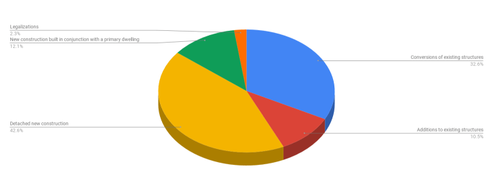 Worse still, many cities, like most of the eastern seaboard of the United States, require that the ADU be an internal or attached ADU. Internal and attached ADUs represent only 31% of our ADUs (add together ‘basement or other attached conversions’ and ‘additions’ below). So, the eastern seaboard is effectively shooting themselves in the foot by eliminating 69% of their citizens’ ADU development potential through this restrictive ADU structural regulation.