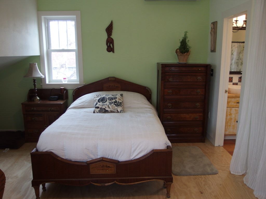 The final challenge was that, in order to move into her 360 square foot ADU, Diane needed to downsize. Fortunately, as they designed the ADU, Hive Architects tucked in as much storage as possible. The way the ADU is designed it has low headroom on both sides where the roof meets the walls. That area where it’s too low to stand is dedicated to storage. Additionally, since she was living in her daughter’s house Diane could leave some of her furniture there. For instance, the dining room table that belonged to her grandmother is in use at her daughter’s place. Meanwhile, the space that Diane had occupied in Mara’s house has now become an office for Mara and Andrew.