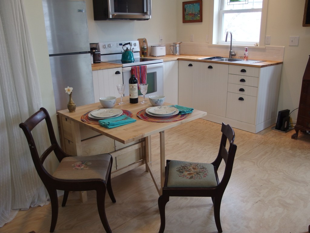 “The roof is set up at right slope and we had it looked at by solar panel people. We can fit an array of panels on the south side and that can connect into the whole system. Since the ADU was designed to be energy efficient with good insulation, insulated garage doors, high insulation windows, and the entire thing well sealed, hopefully it can sustain itself.”