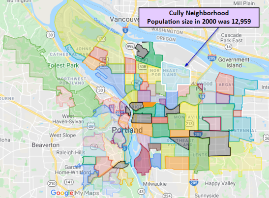 Here’s an image showing the Cully neighborhood, one of Portland’s 94 neighborhoods. Cully had a population size of 12,959 in 2000.