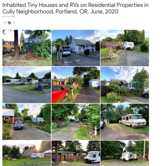 In June, 2020, I conducted some voluntary research to determine how many single family residential properties had an inhabited mobile dwelling. I used my own neighborhood, Cully neighborhood in NE Portland, Oregon, as the formally defined boundary of my study geography. I then proceeded to ride by bike, and assess every single family residential property to determine whether there was an inhabited mobile dwelling or not to the best of my ability.