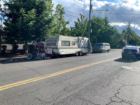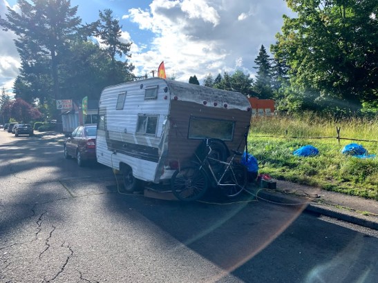 Here’s some inhabited RVs on public, commercially zoned street ways in the heart of the Cully neighborhood. Officially, this habitation of vehicles and RVs is forbidden under current regulations on public rights of way. But, in practice, there’s kind of an implicit acceptance that RV habitation, really anywhere in Portland, is more or less condoned in light of the declared housing emergency, whether it’s formally allowed or not. This is, in fact, a quite common phenomenon in Portland.