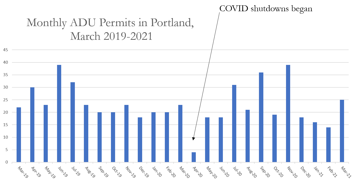 Indeed, it’s unlikely that we will be able to see much statistical impact on ADU permits from COVID. Typically, ADU development takes at least a year, so even if someone definitively decided to build an ADU in March, 2020, they may likely be still building that ADU today. So, their ADU wouldn’t necessarily be reflected in permit data until we have aggregated 2021 permit numbers, which won’t be till sometime in 2022. More commonly, deciding to build an ADU will take a year or two, so people who have been motivated to build an ADU due in part to COVID, will still be the design development phase of the process and will begin in earnest in the next couple of years.