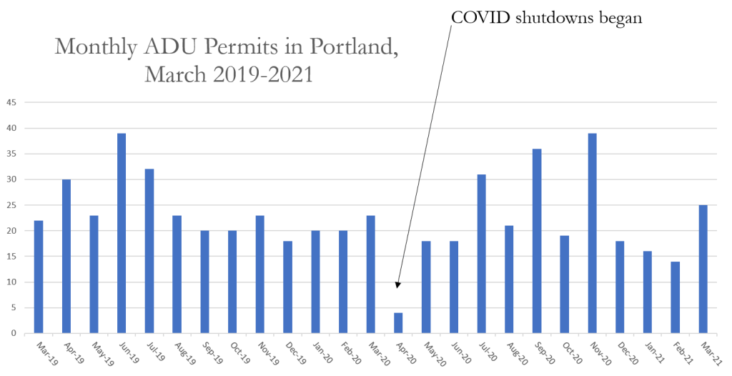 This is one of the more common questions that I’ve received from journalists since March of 2020 when pandemic shutdowns began. Predictably, there was a dramatic drop in ADU permits in March and April, 2020, as the country entered into a lockdown and the City of Portland attempted to transition to an entirely digital permit intake process. Beyond that one dramatic dip in March & April 2020 however, there’s no discernable pattern on ADU permits since the pandemic.