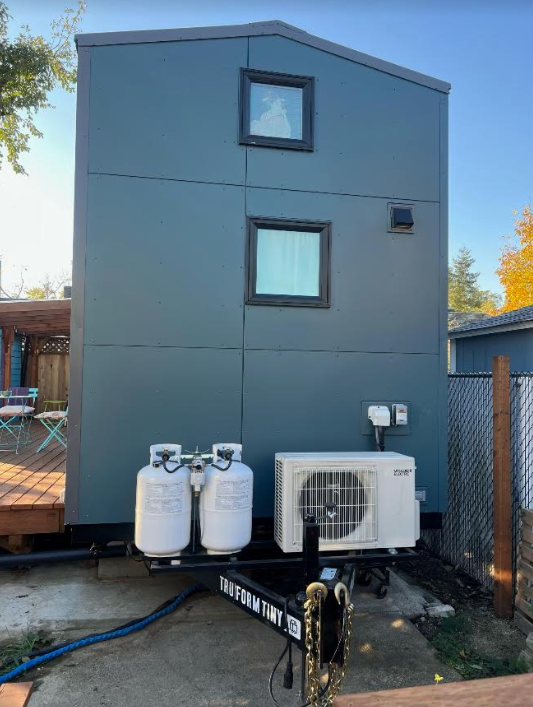 This tiny house on wheels, called Skyline, was previous located at Caravan- The Tiny Hotel House. Because it’s mobile, I’ve relocated it several times in the last few years. It’s been out in the Columbia River Gorge, then in SE Portland as a long-term rental. Now, it’s located back in inner NE Portland, and being used as a long-term rental unit. It will stay here for the foreseeable future. Through my company, Tiny Hookups LLC, I installed the RV hookup infrastructure for it.