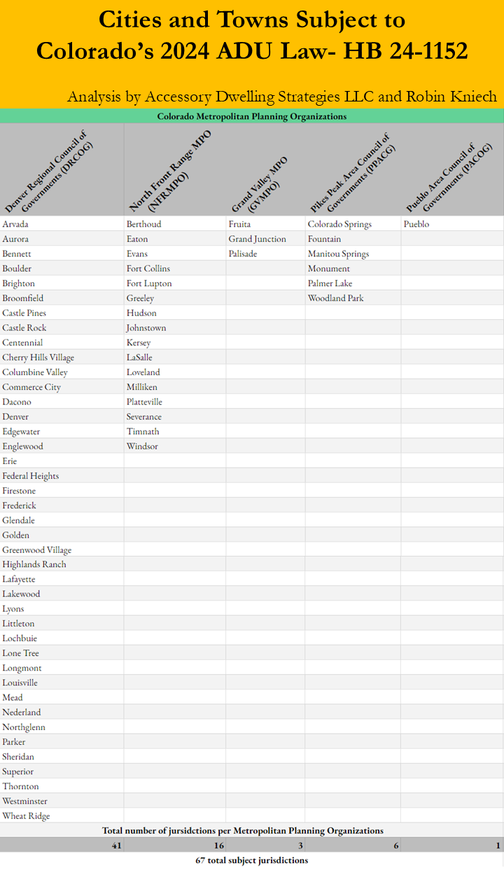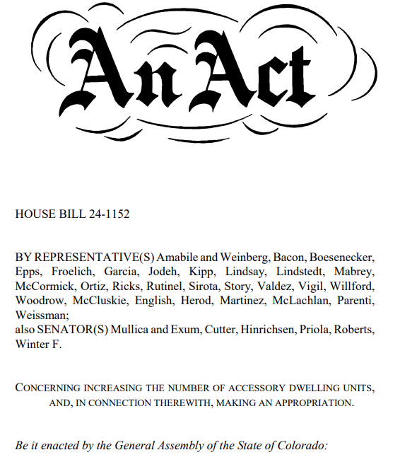 Colorado has passed a strong ADU law (House Bill -1152), making it the 5th state to pass strong ADU legislation.
