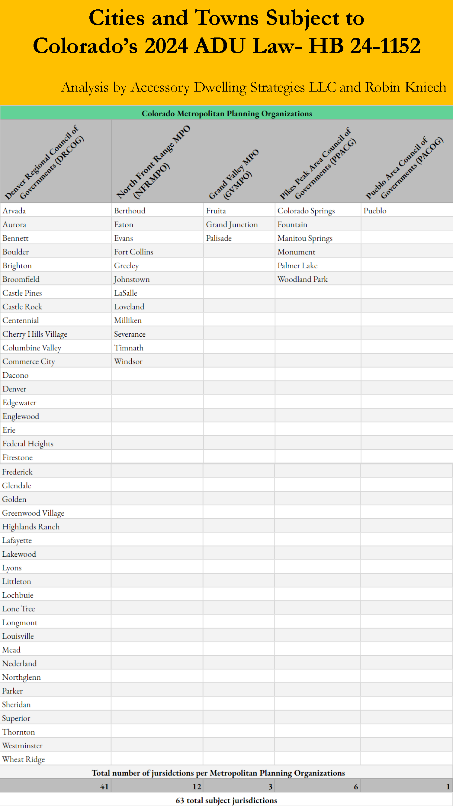 This blog post was revised at 7:11 pm on 7/10/24 to correct typos in the bill number, and to update the total number of jurisdictions and percentage of the state covered by the final version of Colorado’s ADU law HB24-1152 signed into law and to add the table of covered jurisdictions below.