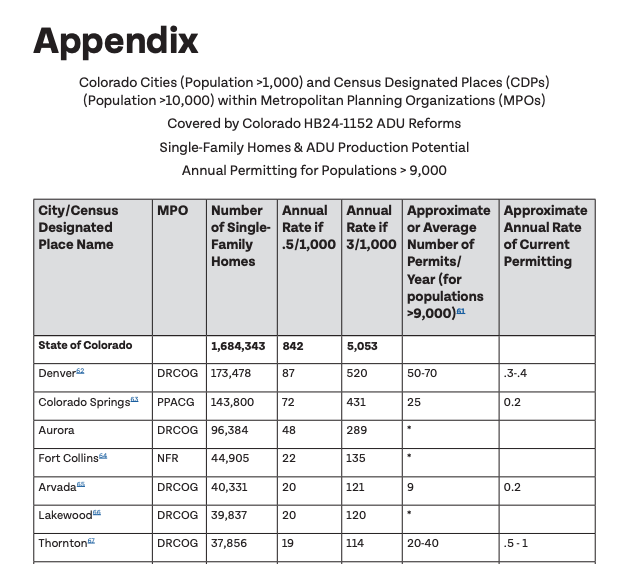 My paper, Can ADUs Deliver on the Promise of Affordability for Colorado? includes the first-ever baseline data on ADU permitting in the largest 32 of the 64ish local communities required to allow ADUs under the new law.