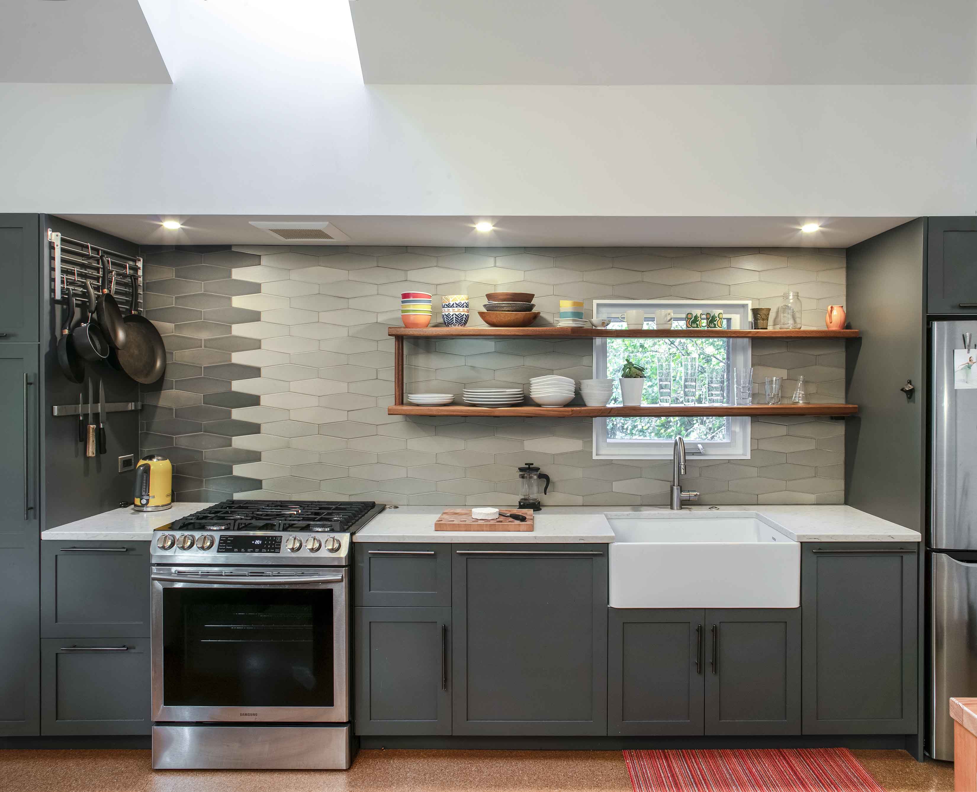We’re thrilled with how the combination of materials works together in and outside of the space. The ample ceiling height and 16′ x 8′ window wall make the space feel much larger than on paper.