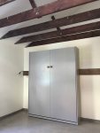 There’s a queen sized Murphy bed. I thought with such a small space it was important to at least get the largest piece of furniture up and out of the way. Plus you don’t have to make it to flip it up!